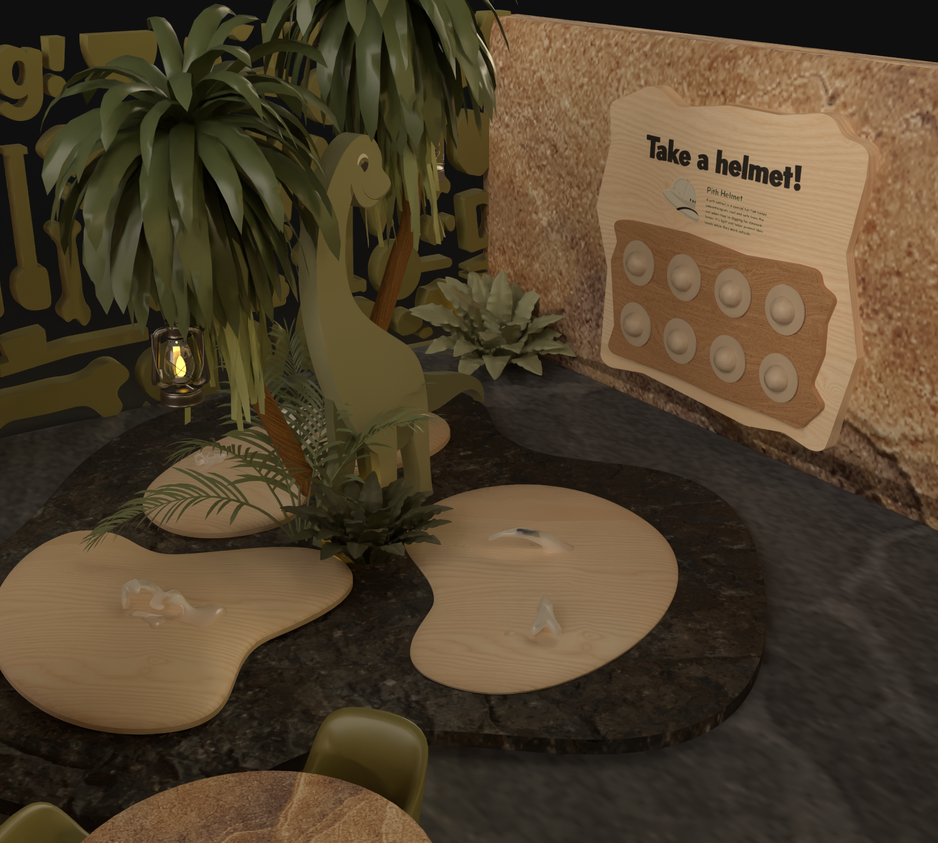 A conceptual educational children's fossil dig exhibit designed to inspire children’s curiosity about paleontology and dinosaurs. Children can “dig” in a sand pit for dinosaur fossils, emulating a professional paleontologist. A cafe and seating area offers a place for adults to relax while the open view of the exhibit allows for easy supervision.